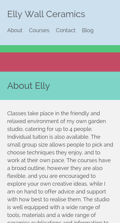 Single page site for a ceramicist with navigation links jumping visitors down the page. The site was built as a static website and updates to the site were done by myself or by Elly's partner who is comfortable editing HMTL.