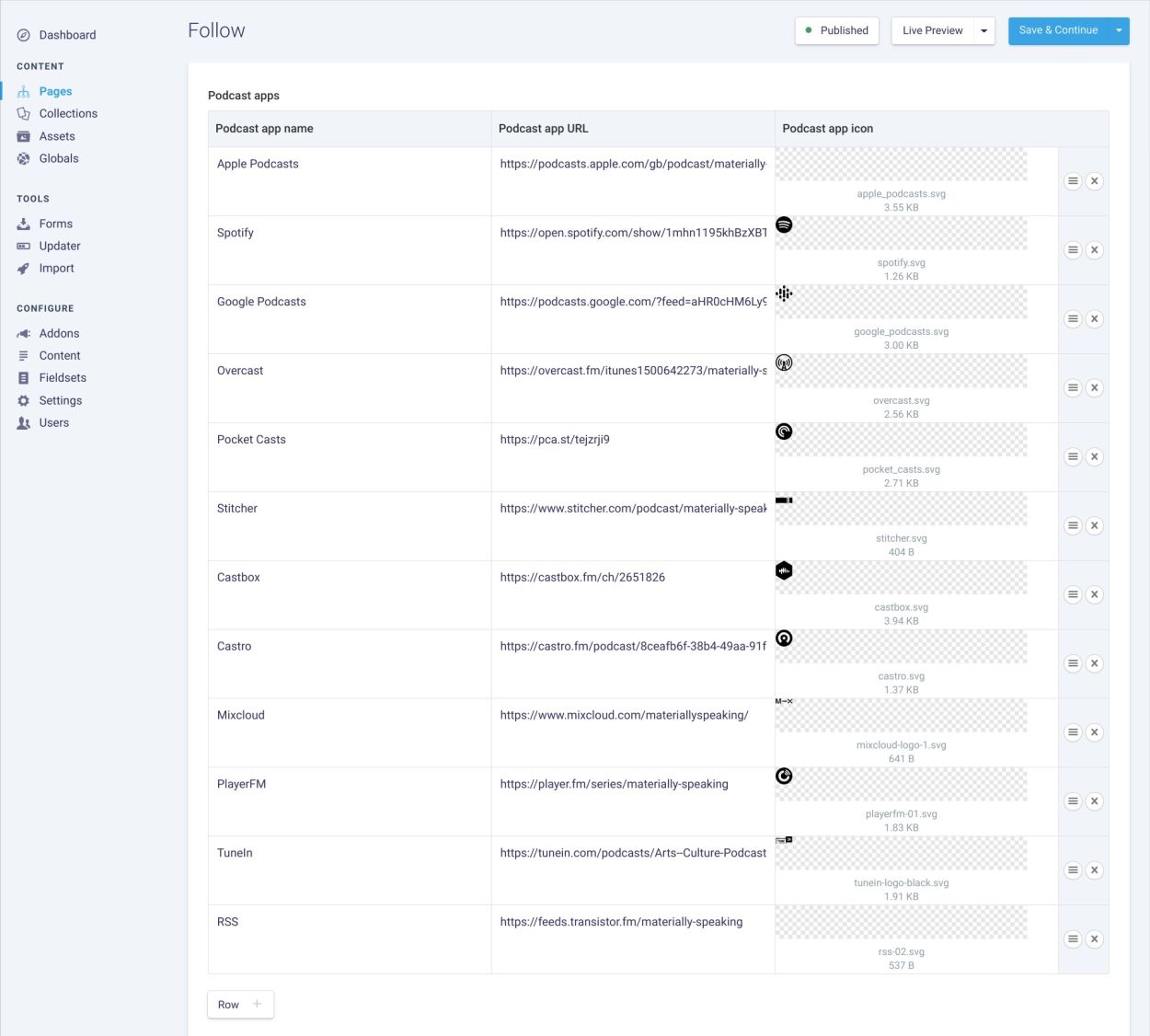 Compared to my experiences with other CMSs, Statamic is vastly superior. This is especially true when it comes to configuring the authoring experience for editing content in the control panel. Statamic allows me as a developer to define the fields and their layout to best match the content or an authors needs. By way of example, the Follow page has one or many podcast apps which are perfectly suited to a Grid (as in this case) or Replicator fieldtypes. (NB: I borrowed the podcast app icons from Transistor's subscribe pages).