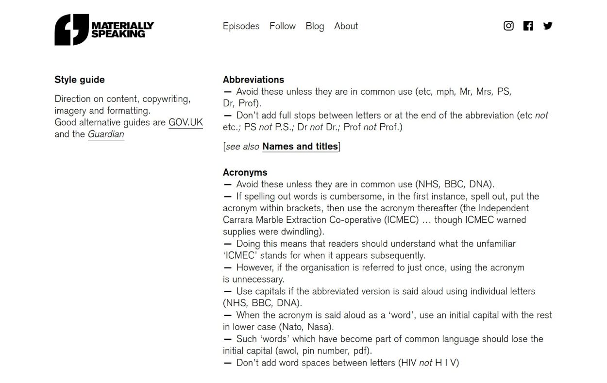 Statamic was once again the obvious choice for the CMS and this was my 13th site with it. I don't think we stretched any creative or technical boundaries with the site per se, but having looked around it does stand above and beyond most podcast sites. It's clear, it's fast, and it has lots of images and links useful for listeners. Peter and I (mainly Peter) even developed a style guide – hidden from view to visitors to the site, but shown below – which was an added feature to help Sarah establish visual and verbal consistency across the show notes.