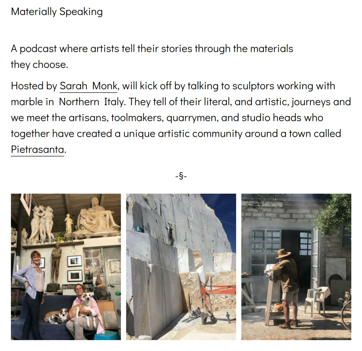 Producer and host Sarah Monk, (who works at my previous workspace in Kentish Town, London, Workplace Co-operative 115) was initially looking for help in creating a website, but this soon evolved into how the podcast would be distributed and marketed. In the first series, listeners were enlightened on the processes, livelihoods and context of the sculptors of Pietrasanta in north-west Italy through weekly, then fortnightly episode releases.