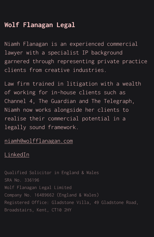 Niamh is my neighbour and she's a lawyer who's recently set up on her own. She has a broad commercial background with has a specialism in intellectual property (IP) having worked for The Telegraph, The Guardian and Channel 4. As with me, she works mainly with small, creative businesses.